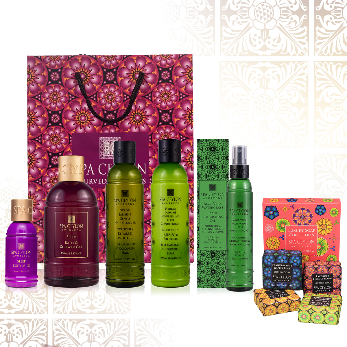 スパセイロンは、アーユルヴェーダの本場・スリランカで、アーユルヴェーダ専門医とともに開発されたスパ発のスキンケアブランドです。お届けするのは、5,000年の歴史を誇るアーユルヴェーダの教えを活かしながら、現代に合わせてより進化させた”ラグジュアリー アーユルヴェーダ“。スリランカ王室の伝承にもとづいた高品質な植物を用いるレシピに、ハーブの香りを融合することで、モダンでラグジュアリーな製品に創り上げました。世界的にも珍しいセイロンティーの精油により、心を穏やかに保ち、より輝きのある肌へ導きます。パッケージやストアには、まるで宝石のように多彩なカラーと、スリランカ伝統文様のアートが散りばめられ、セルフケアの喜びを高めます。ストレスフルな現代人の心と素肌を、植物に宿る癒やしのチカラとやさしいハーブの香りで包み、満たす。ナチュラルですこやかなライフスタイルに、ぜひご活用ください。